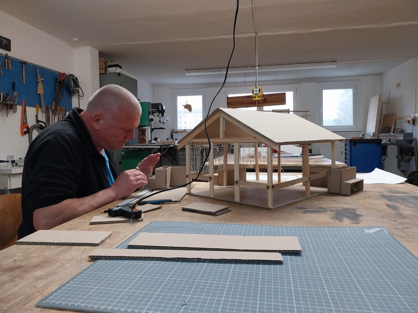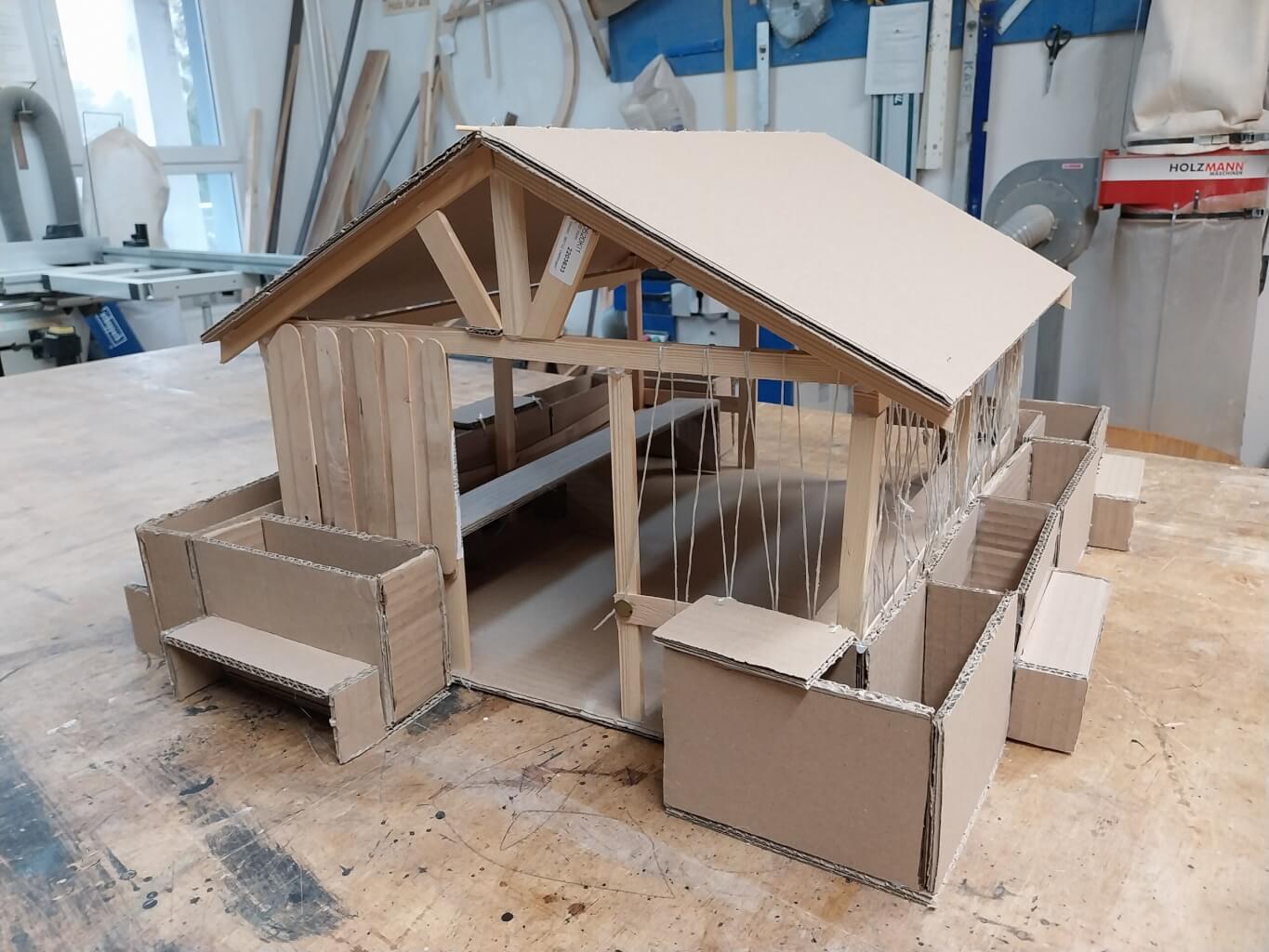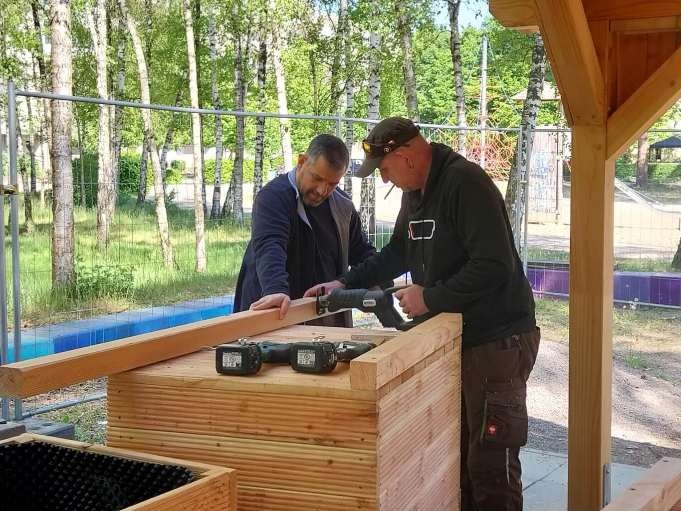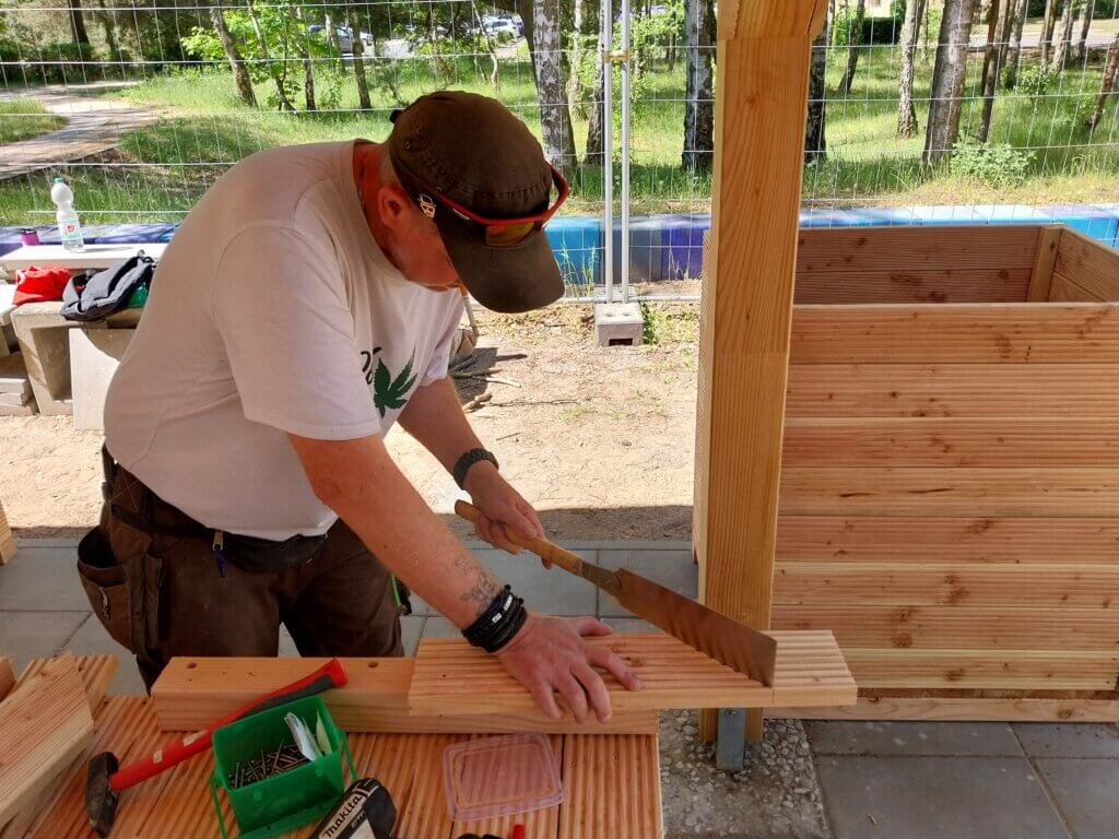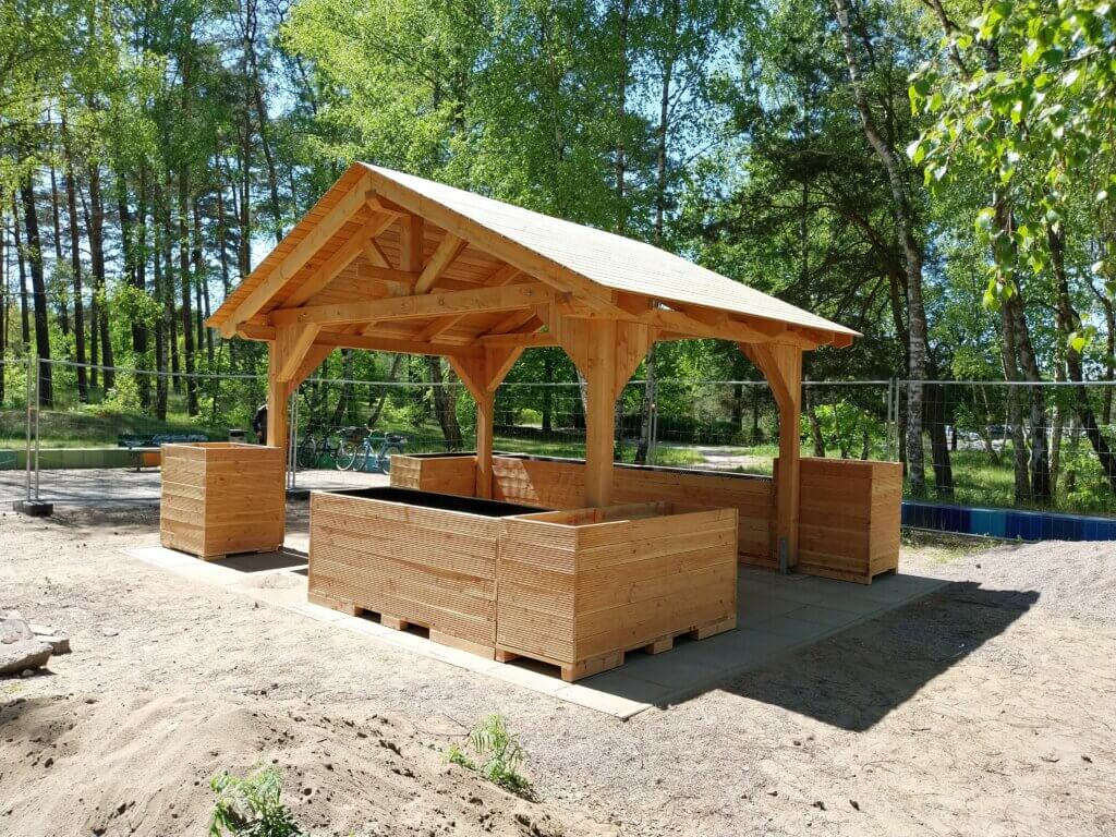 Rings um den Pavillon stehen Hochbeete, die während der kalten Jahreszeit in unserer Holzwerkstatt entstanden sind. Die Werkstattzeit geht nun in eine neue Runde. Denn zum Draußenarbeiten wird’s nun zu kalt.